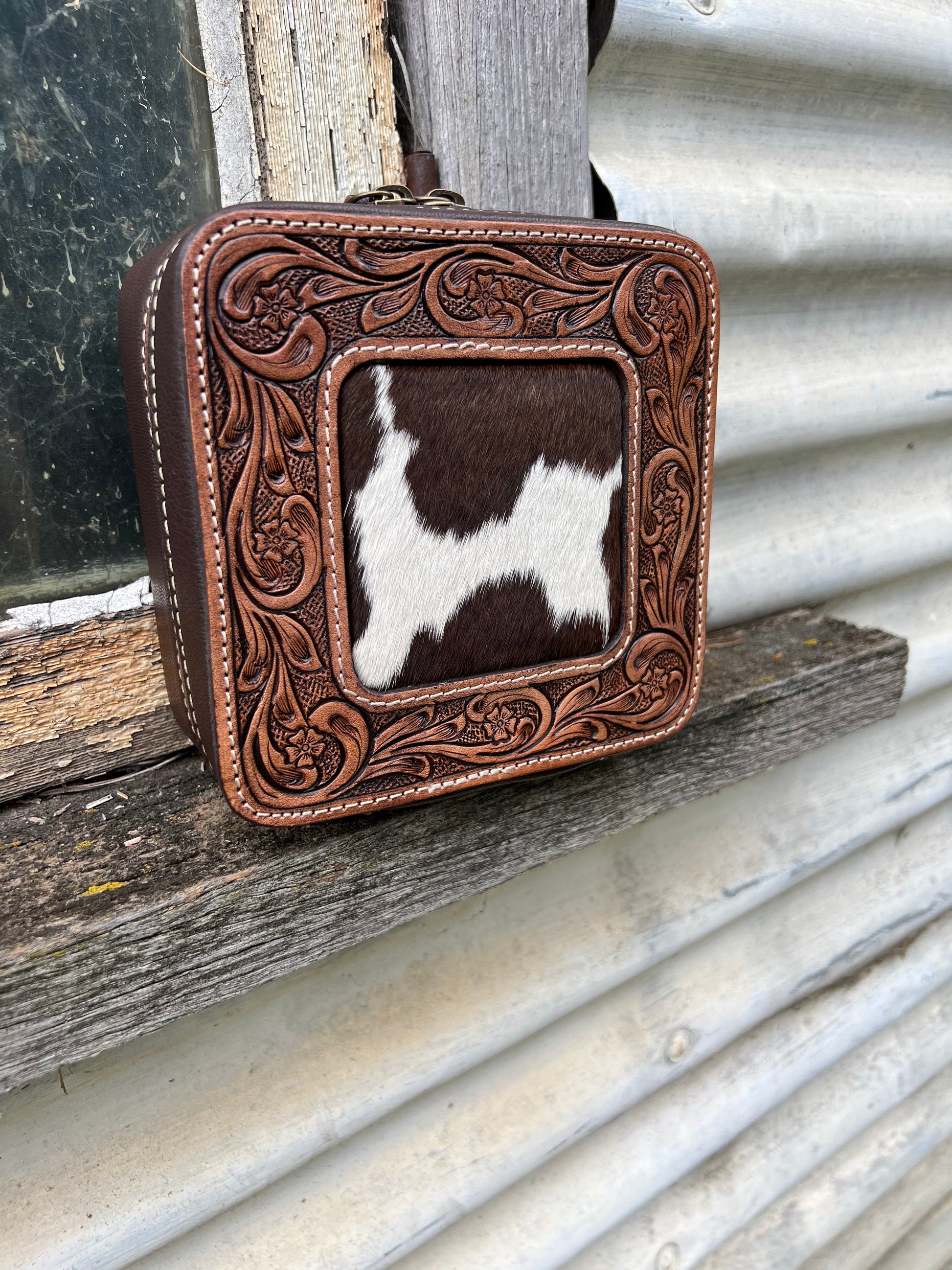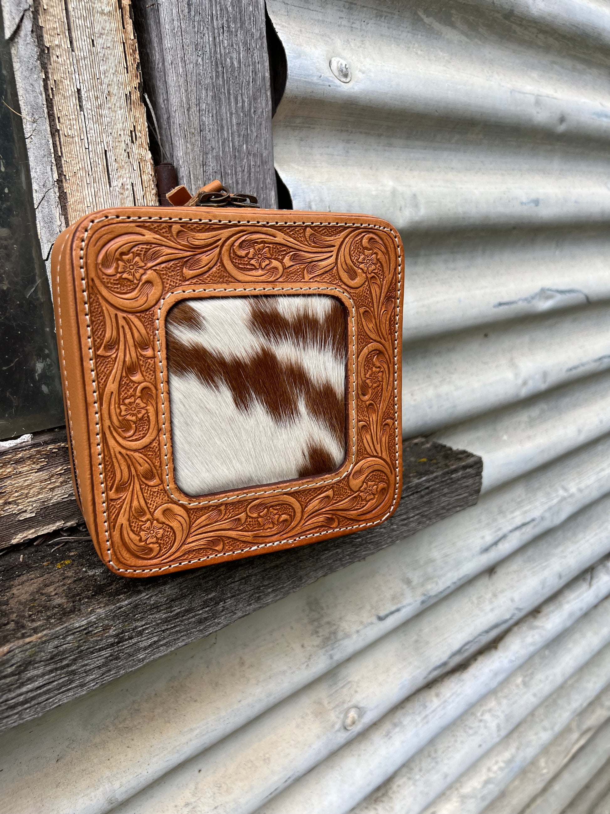 Keep all your jewellery organised and in order with this gorgeous Cowhide Jewellery Box with stunning tooling leather detailing. This beauty features enough compartmentalised room for all your precious pieces. This elegant article is finished off with full zip around closure and tooling leather detailing on top panel.